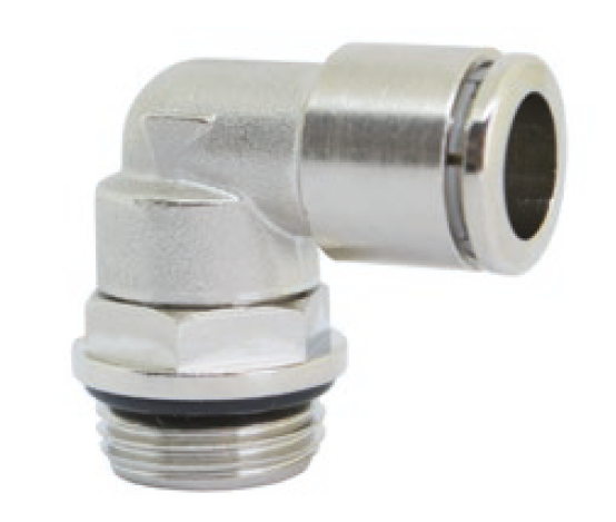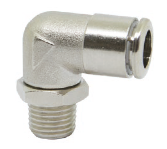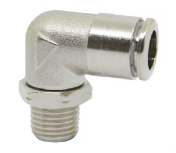 Поворотный коленчатый штуцер с наружной трубной (NPT) и американской унифицированной тонкой (UNF) резьбой никелированный.