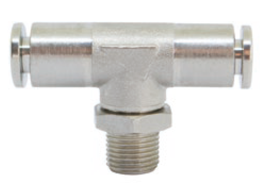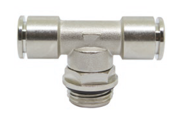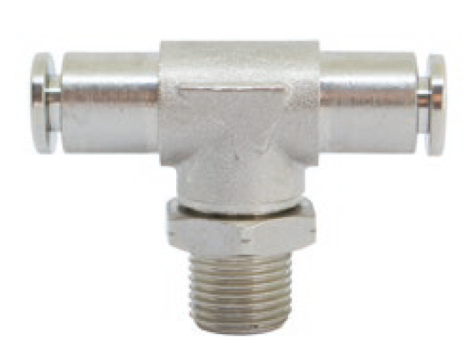 Фитинг тройник поворотный с наружной трубной (BSPP) и метрической резьбой никелированный.